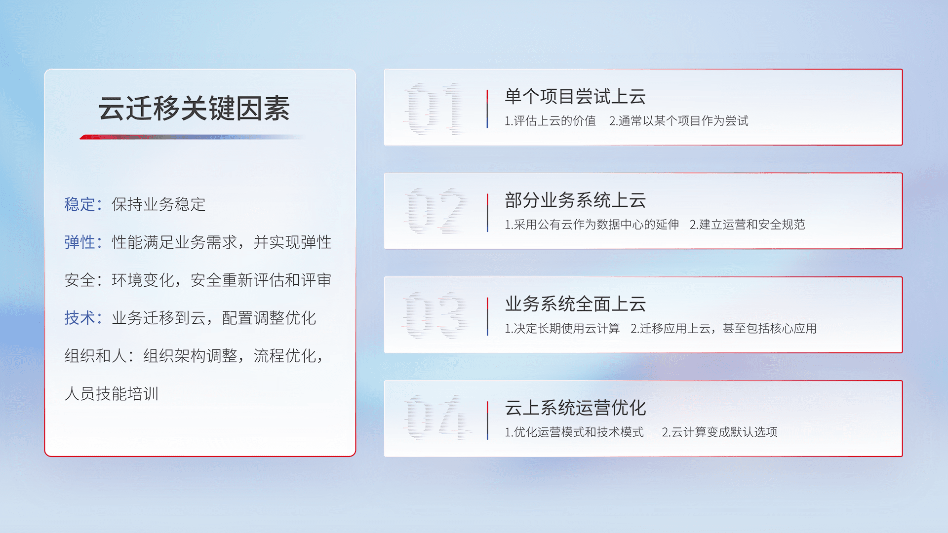 结合实际业务,,,,从规划设计、、云平台选型、、、云原生改造、、、、数据迁移、、、、集成交付,,,迁移全过程为客户识别最佳上云路径,,,做好风险识别管理,,,设计网络架构、、身份权限、、安全审计合规、、、操作审计、、、日志审计、、、、监控告警策略、、、多站点容灾设计等,,,,对云上基础设施进行整体规划,,,提升IT治理水平,,,以满足弹性、、、、高可用、、、、高性能的需求。。。。