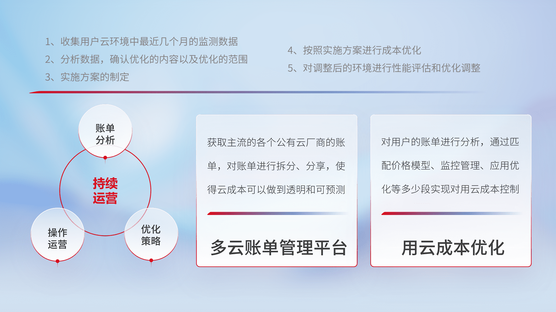 通过多云纳管,,以统一的资源数据模型把客户的云资源进行抽象和封装,,,进而实现对多云资源的统一操作,,保障云资源管理的可靠性、、稳定性与可用性。。。。量身定制化运维内容,,配置、、开发运维、、、、补丁管理、、、备份、、监控、、、认证和访问管理、、、、审计和日常巡检等,,保障在用云过程中的可靠度,,,稳定度以及高可用率。。